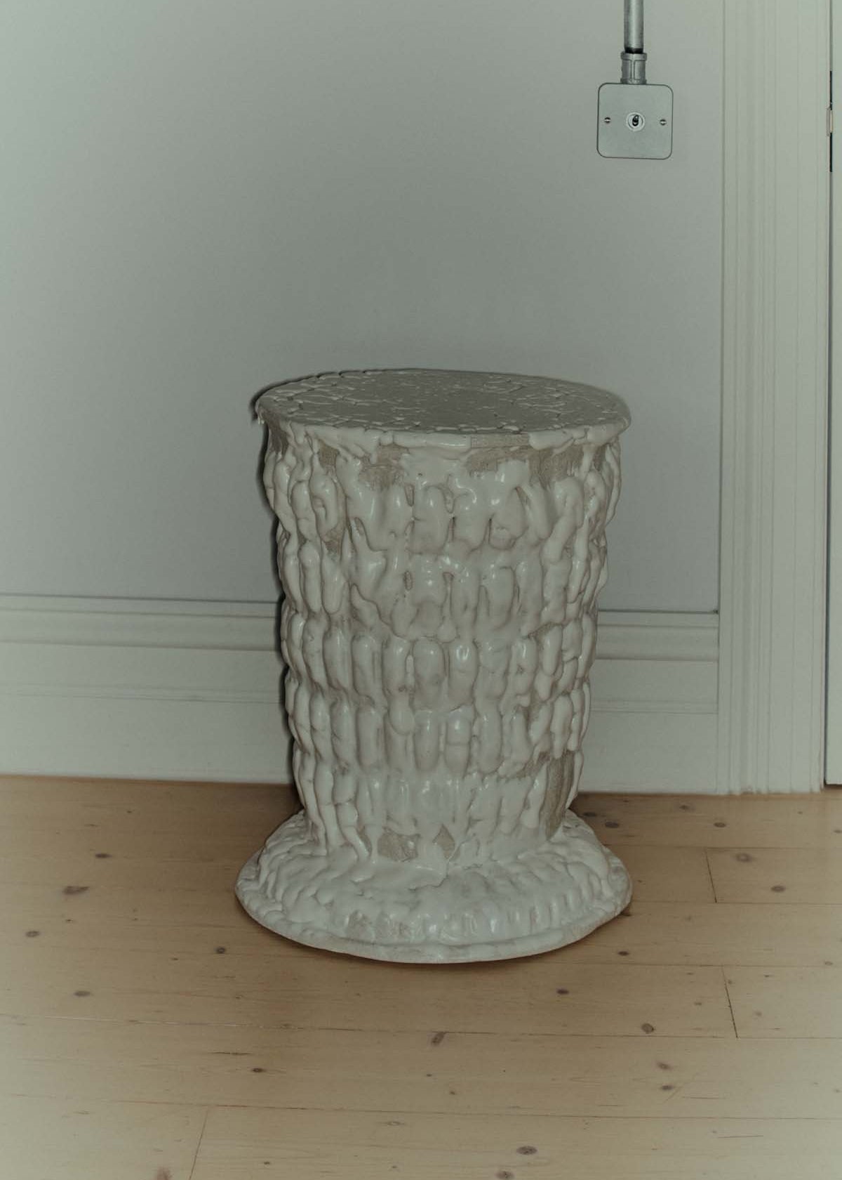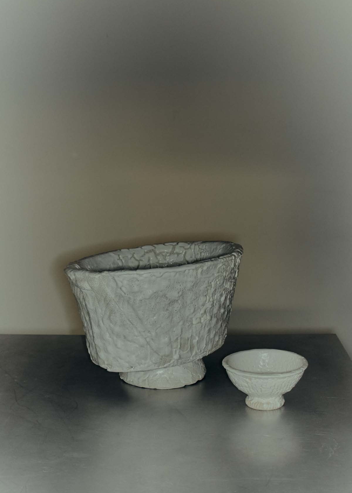 Crafted from clay, a signature material to ALEX AND TRAHANAS, the 3-piece series of hand-built pieces create a rich formaggio aperitivo scene including a side table, a generous Champagne bath and an aperitivo bowl, which all explore a luminous ricotta texture.