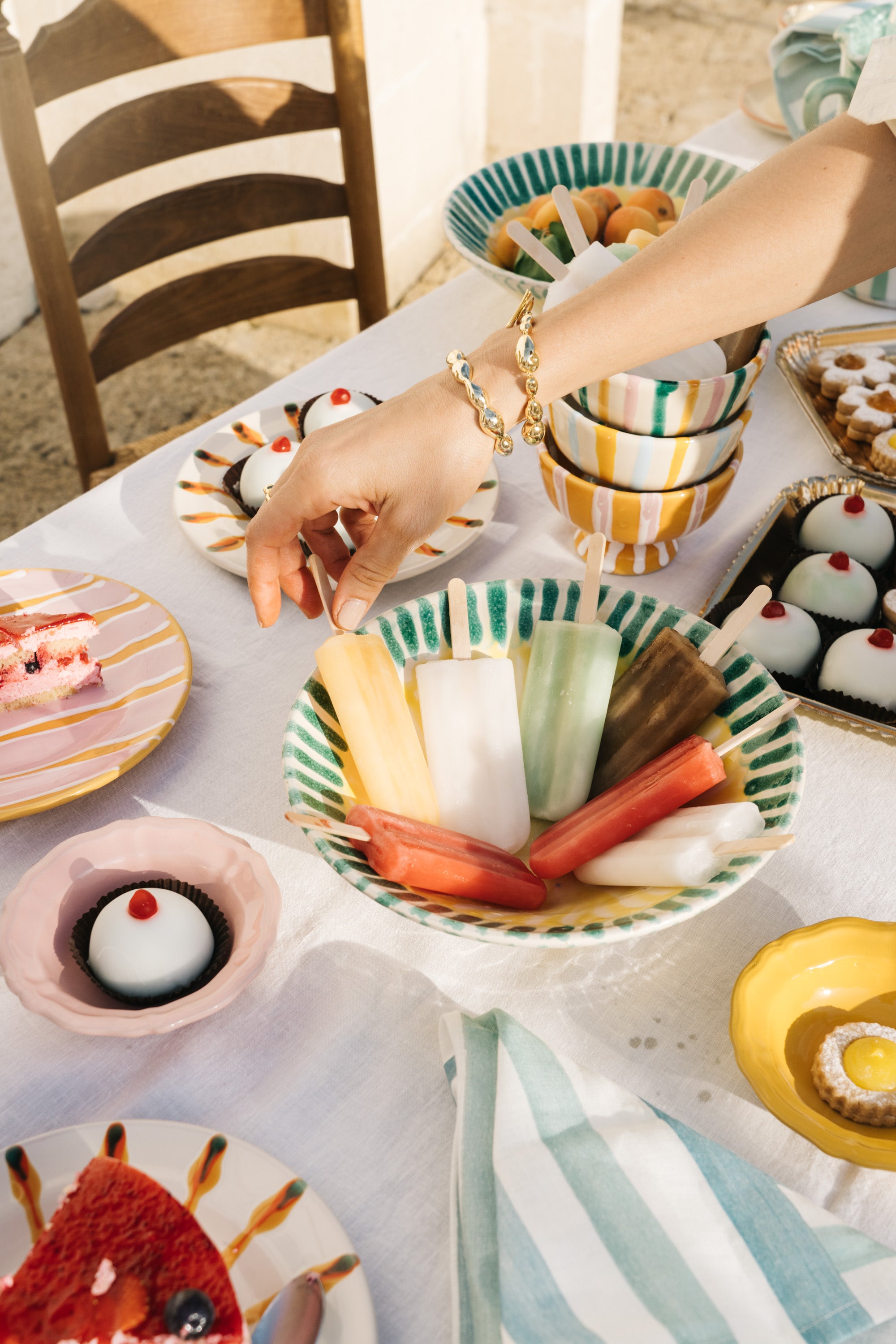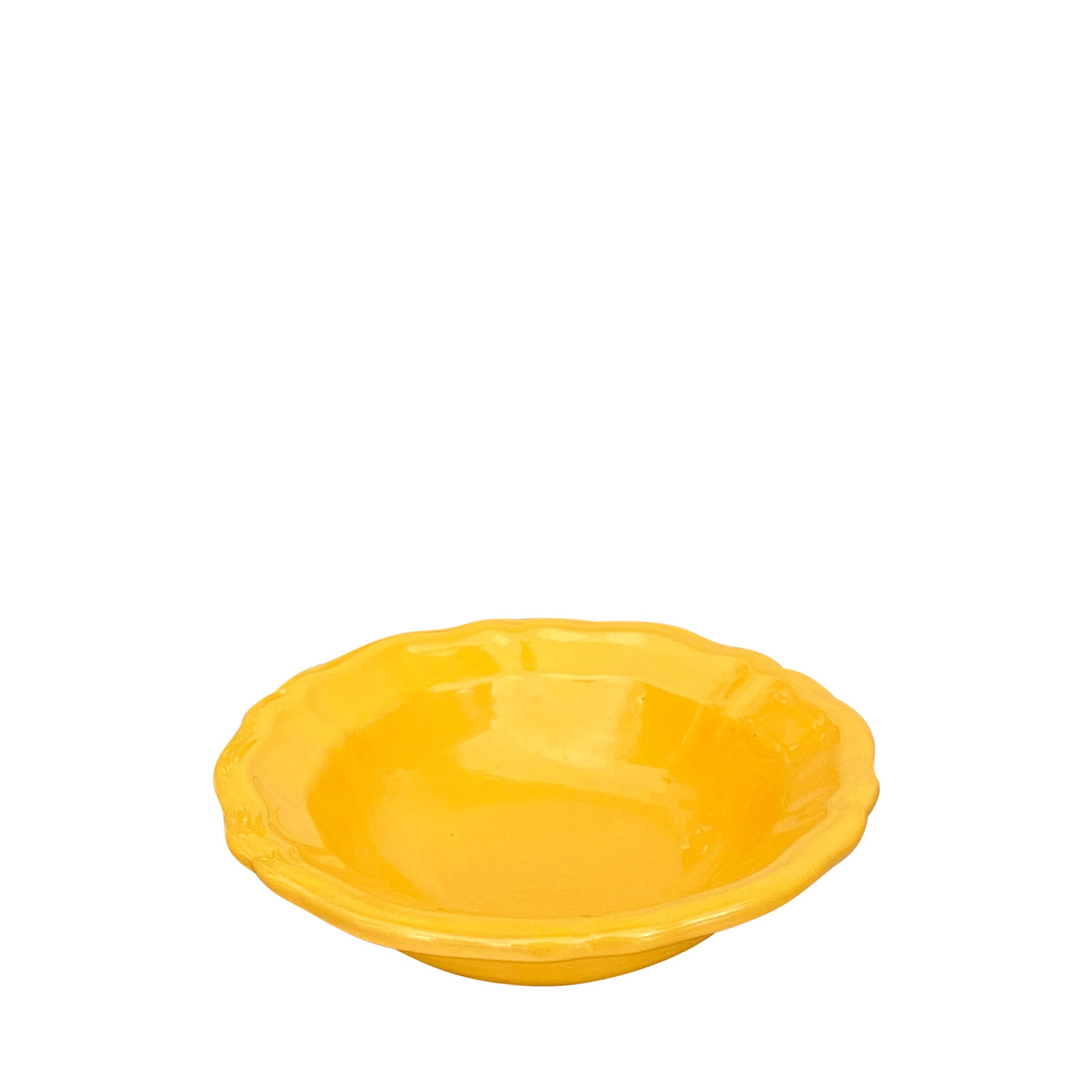 This set of small scalloped ceramic bowls have been hand painted and made by artisans. Each piece brings joy to the entertainers table with its traditional scalloped form and fruity palette. These versatile pieces have been designed to hold dips, olives and snacks for an afternoon aperitivo or long-table entertaining occasions.