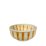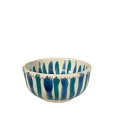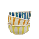 The Small Striped Ceramic Bowl trio is hand painted and made in Puglia, Italy. This set brings joy to the entertainers table with its Italian summer palette. Designed to hold dips, olives and snacks for an afternoon aperitivo or long-table entertaining occasion.