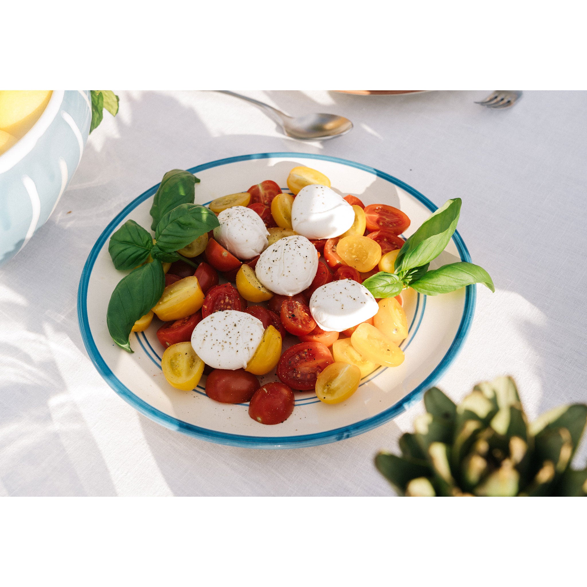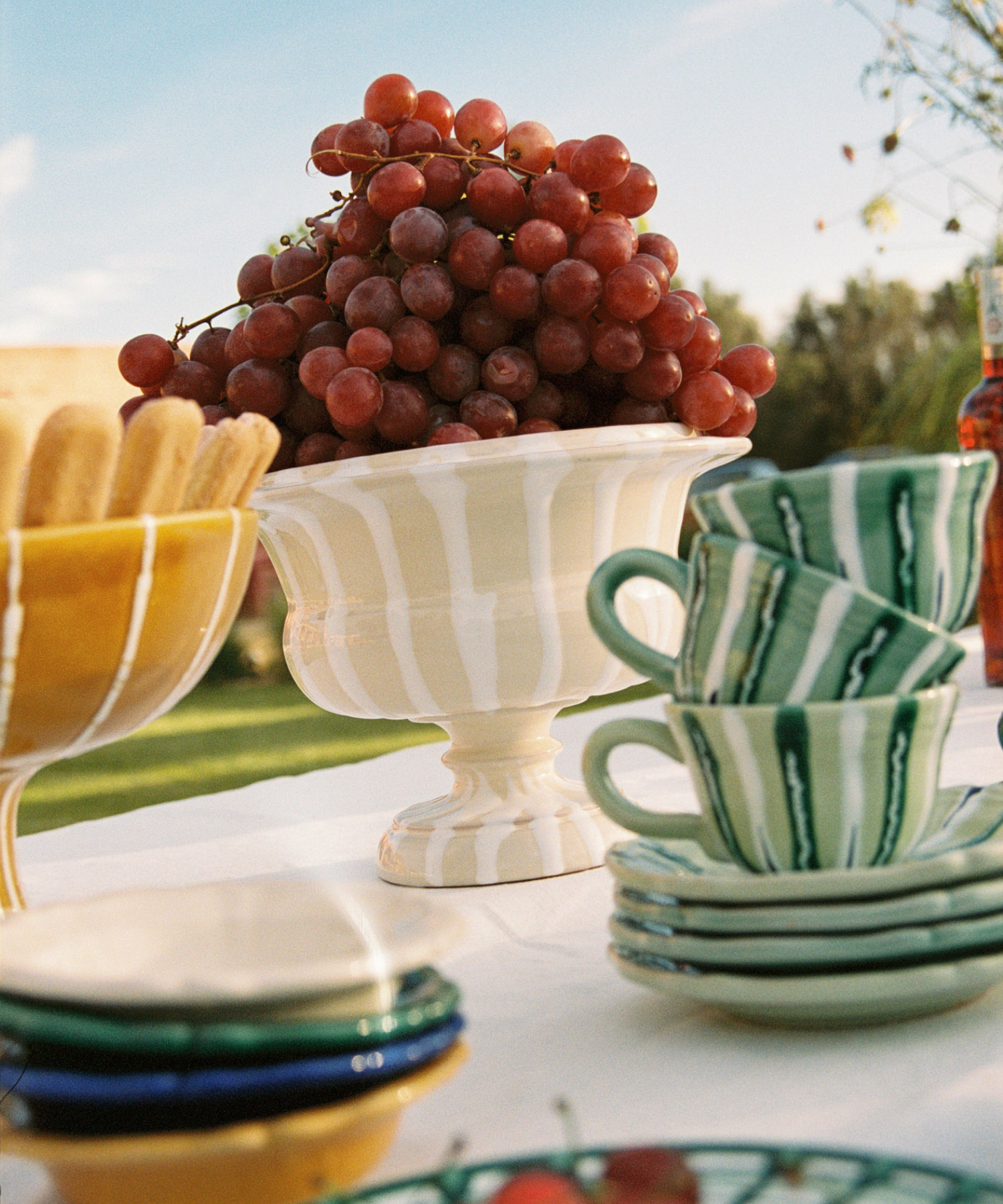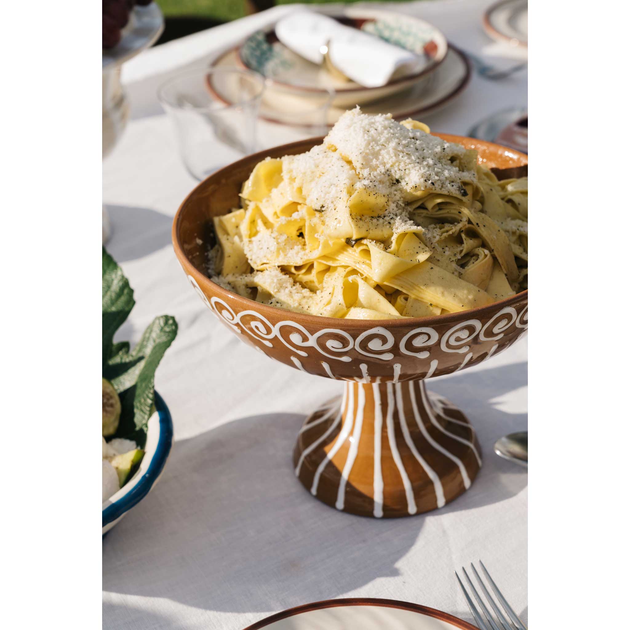 For the Benvenuti table setting, we begin with the Vini Pasta Bowl. An ode to the wreath of Dionysis and Puglia's rich greek and roman history, the Vini Pasta Bowl is adorned with hand-painted grapes; a symbol of celebration, tradition and abundance. The colours have been carefully selected to represent the rich red soils of Puglia and the soft shades of Verdeca grapes native to the region.