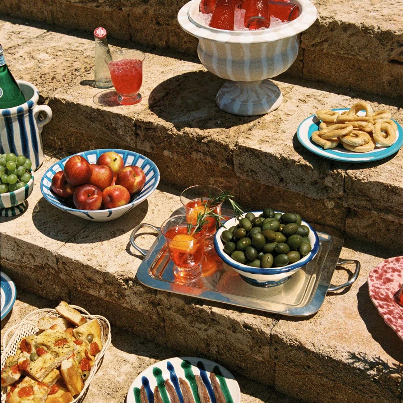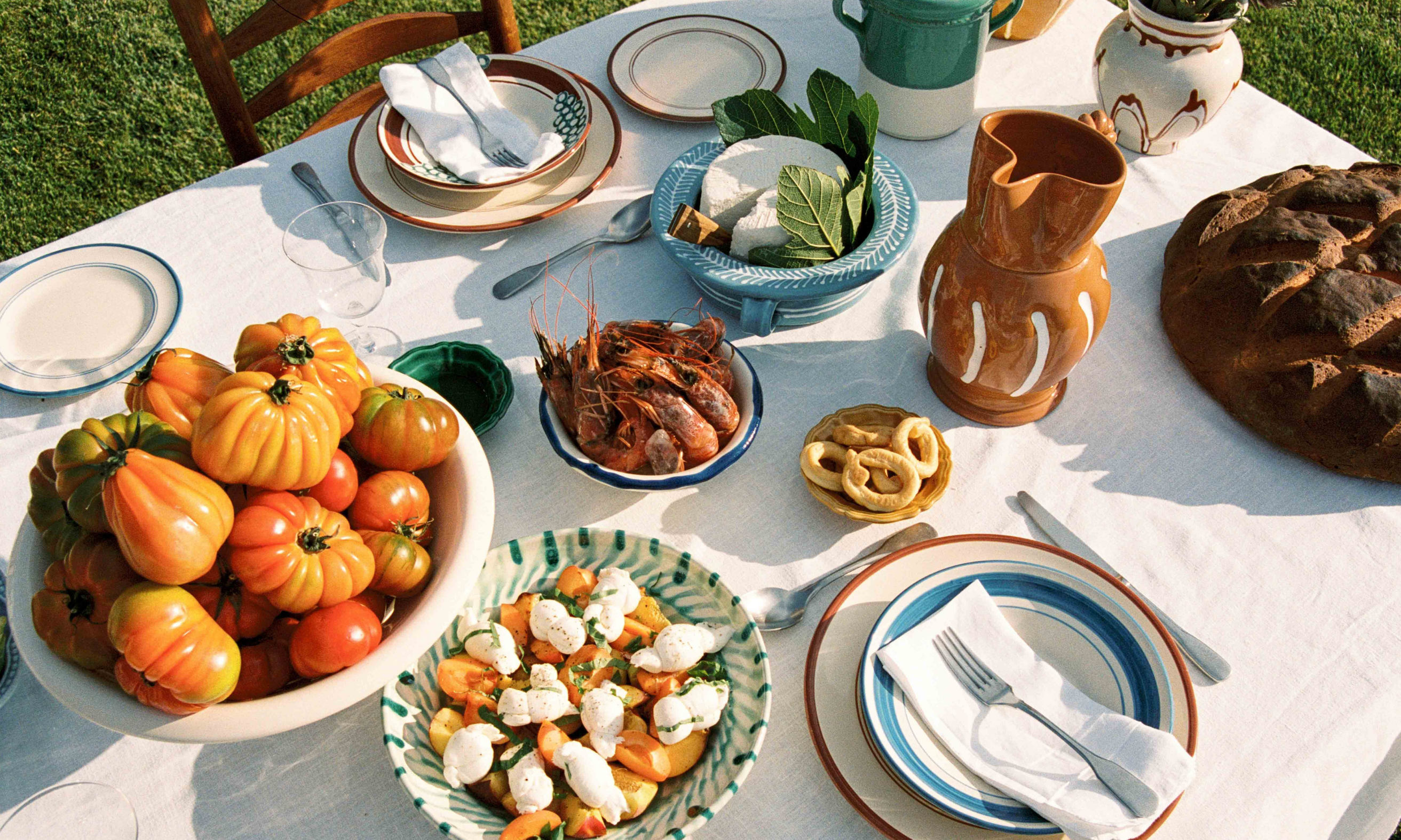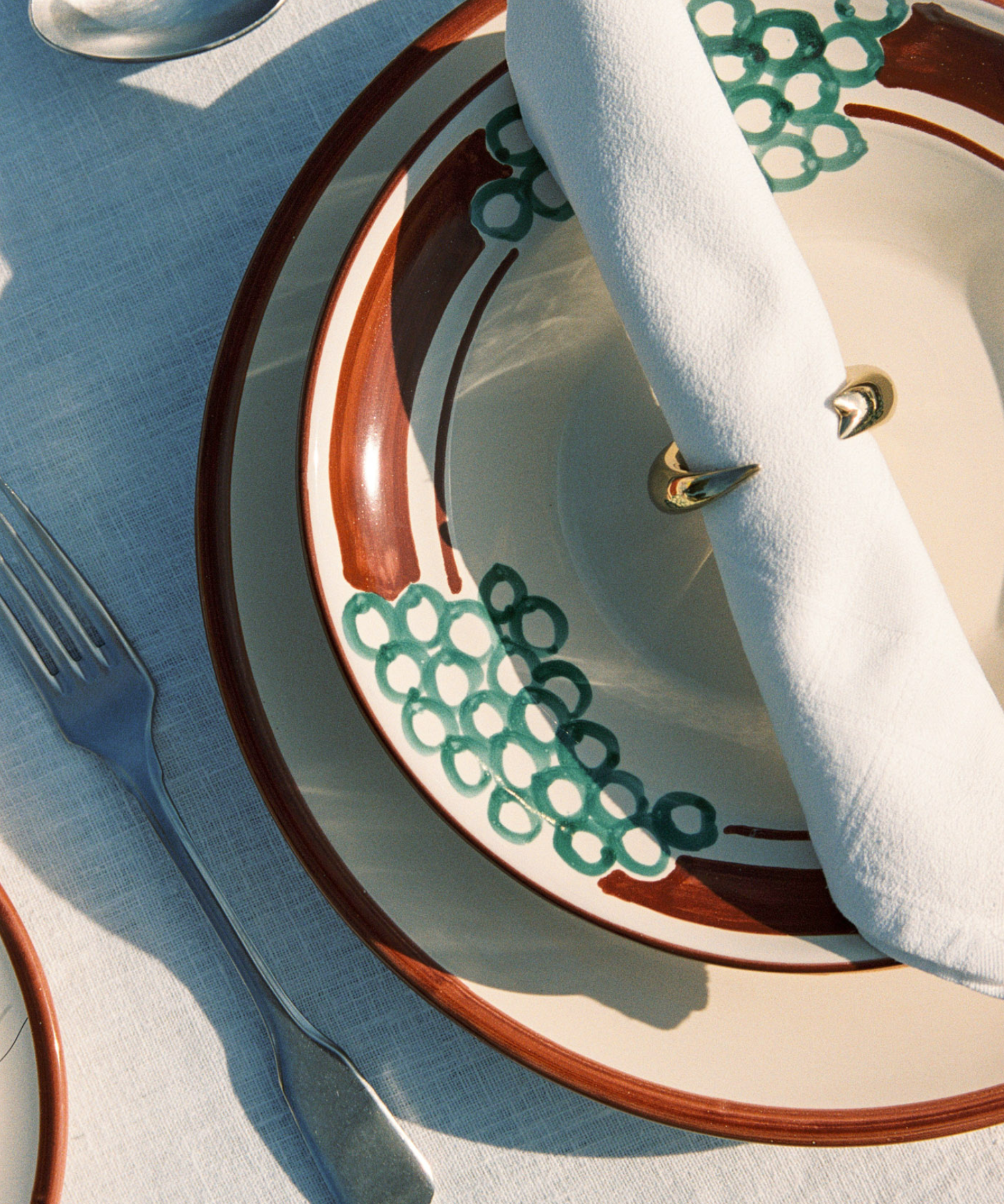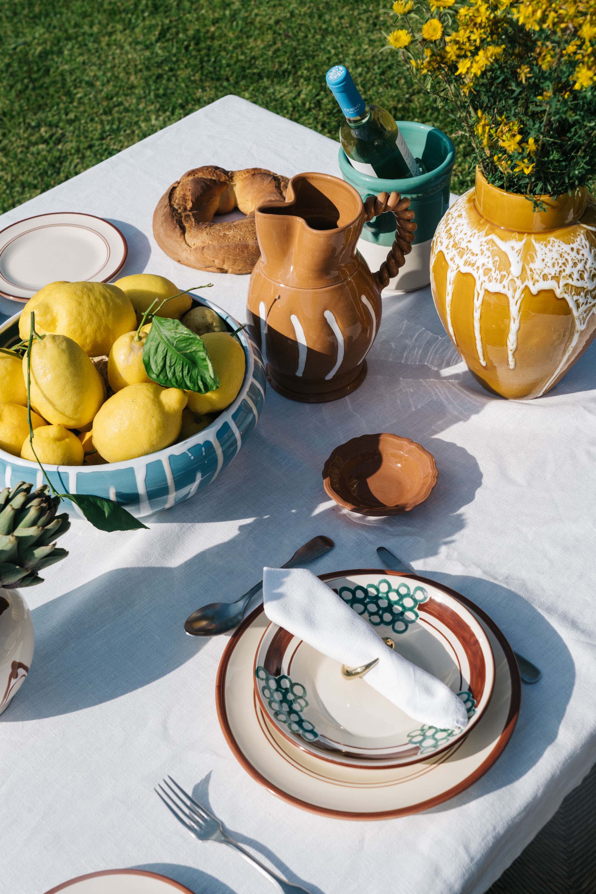 For the Benvenuti table setting, we begin with the Vini Pasta Bowl. An ode to the wreath of Dionysis and Puglia's rich greek and roman history, the Vini Pasta Bowl is adorned with hand-painted grapes; a symbol of celebration, tradition and abundance. The colours have been carefully selected to represent the rich red soils of Puglia and the soft shades of Verdeca grapes native to the region.