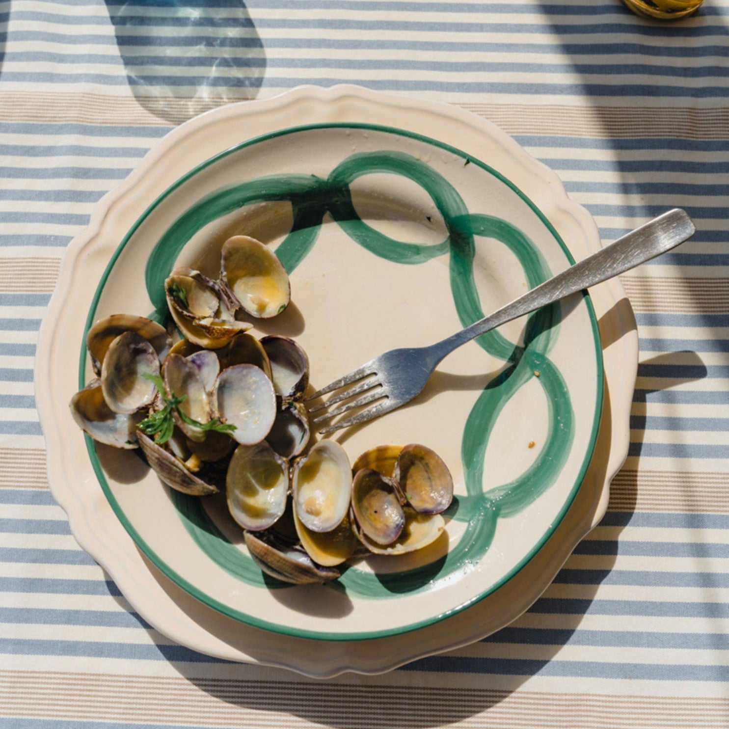 The Eliá ceramic pasta bowl set has been hand-painted by artisans with a painterly, bold olive form. The cream and white palette brings an understated elegance to entertaining occasions. Set of 4