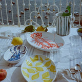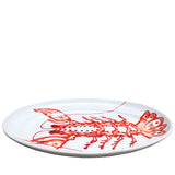 The Lobster ceramic large oval serving plate is hand painted and one-of-a-kind. Each piece brings its own personality and talk-ability to the entertainers table with its bold painterly lobster artwork.