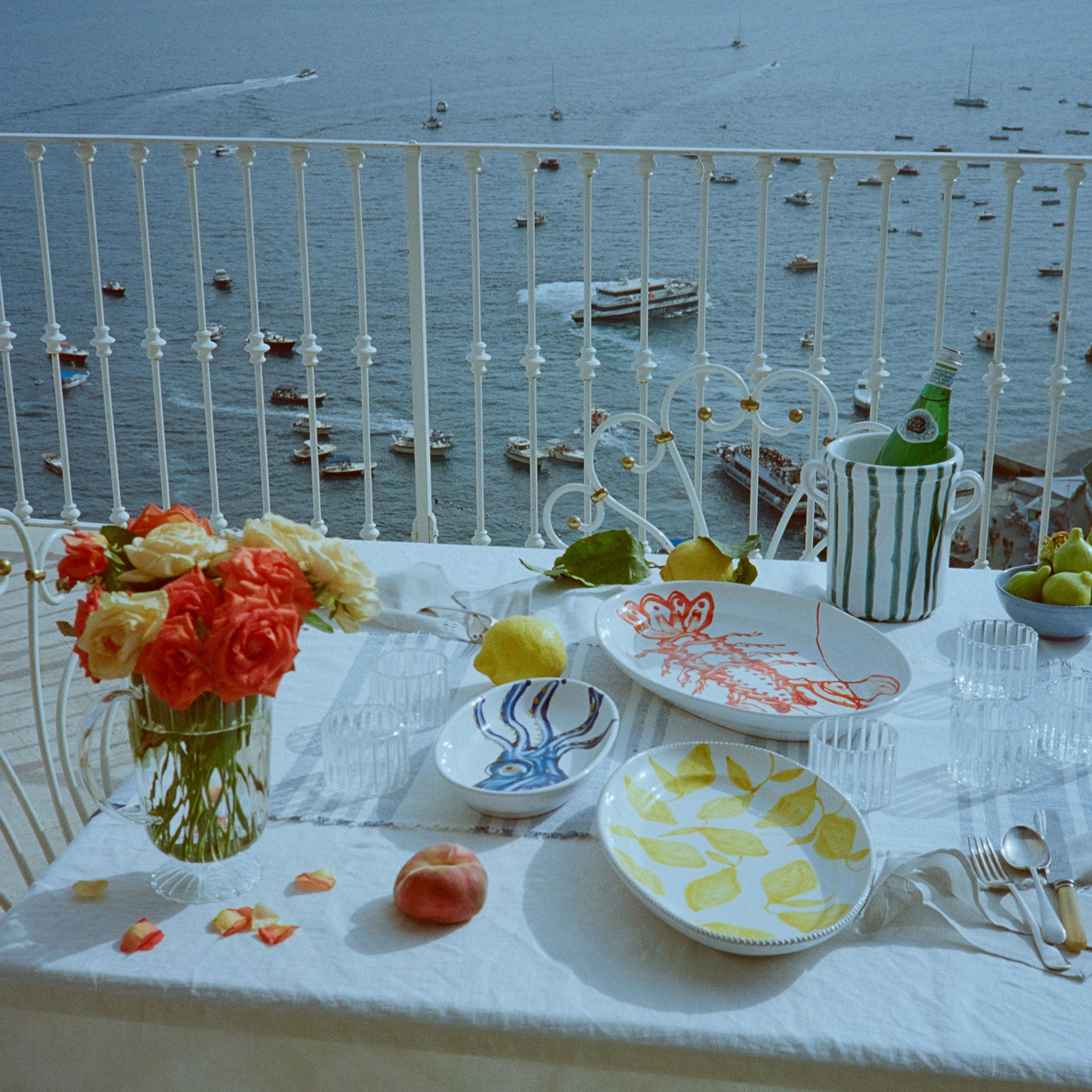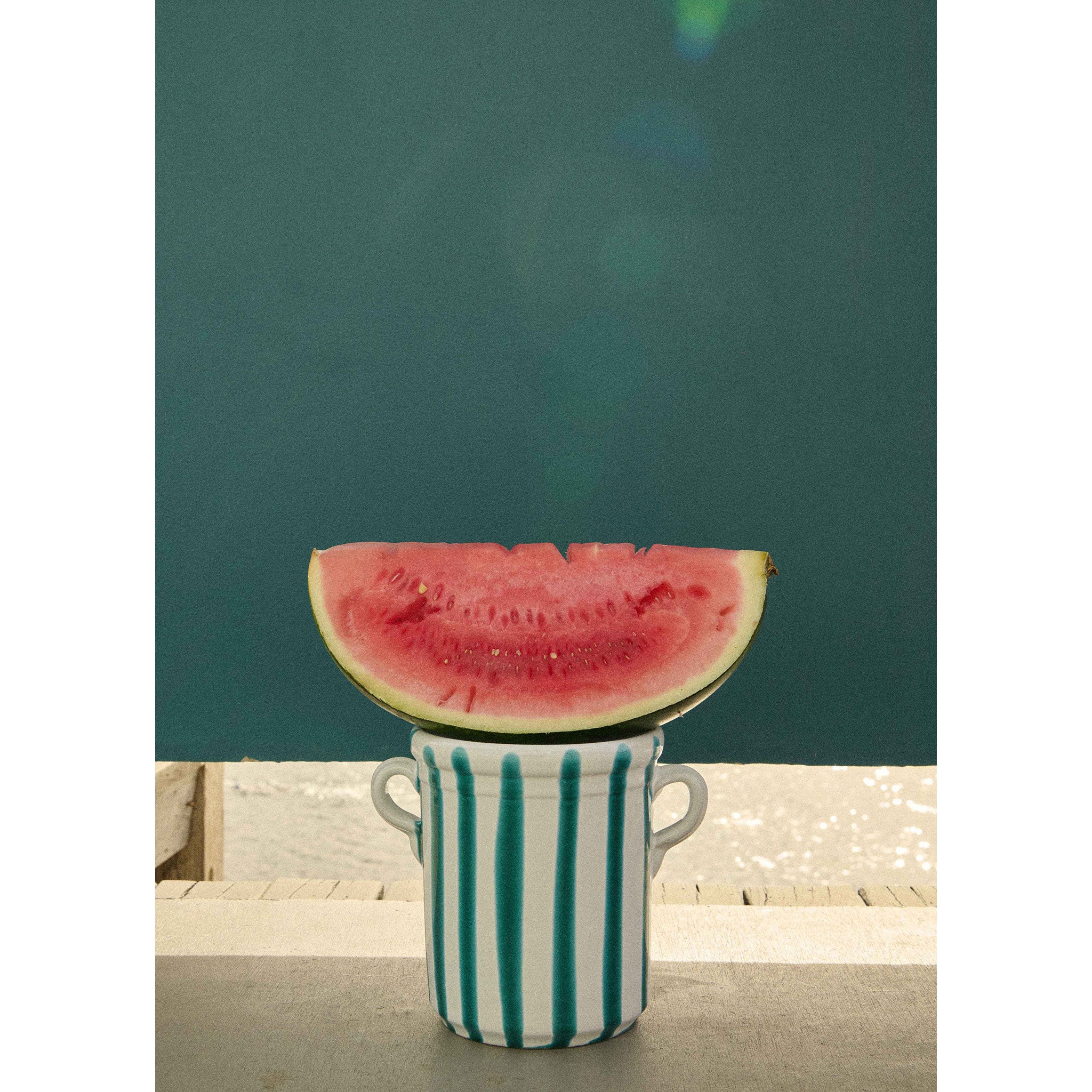The Lido wine cooler is hand painted and each piece is one-of-a-kind. In a palette inspired by the Mediterranean sea, this piece perfect for the table of an avid entertainer or simply a piece to enjoy in the home.
