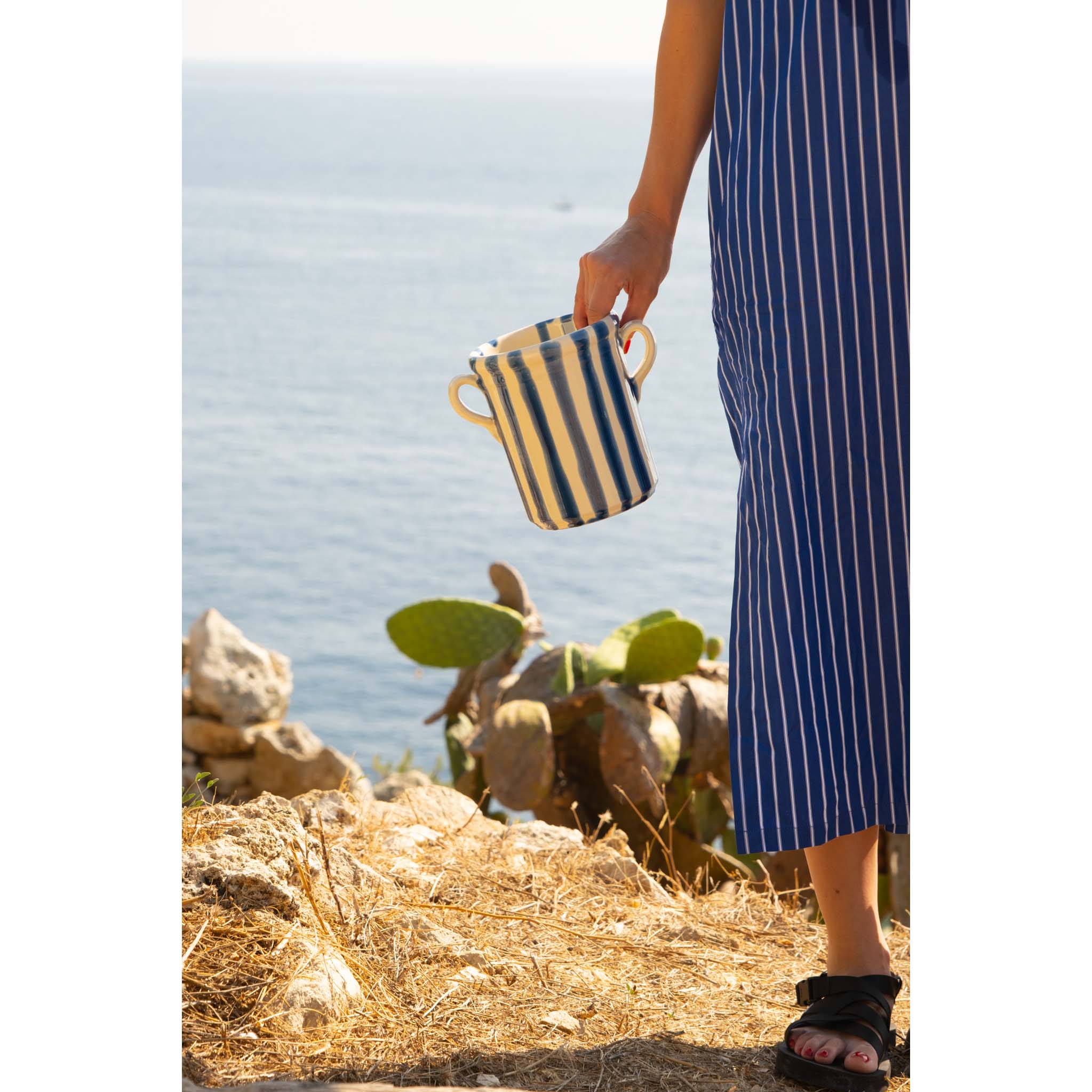 The Lido striped ceramic wine cooler has been hand painted and made in Puglia in a palette inspired by the Mediterranean sea. Designed to bring a piece of Puglia to your home and table top as both a wine cooler or vase, this piece makes the perfect gift.