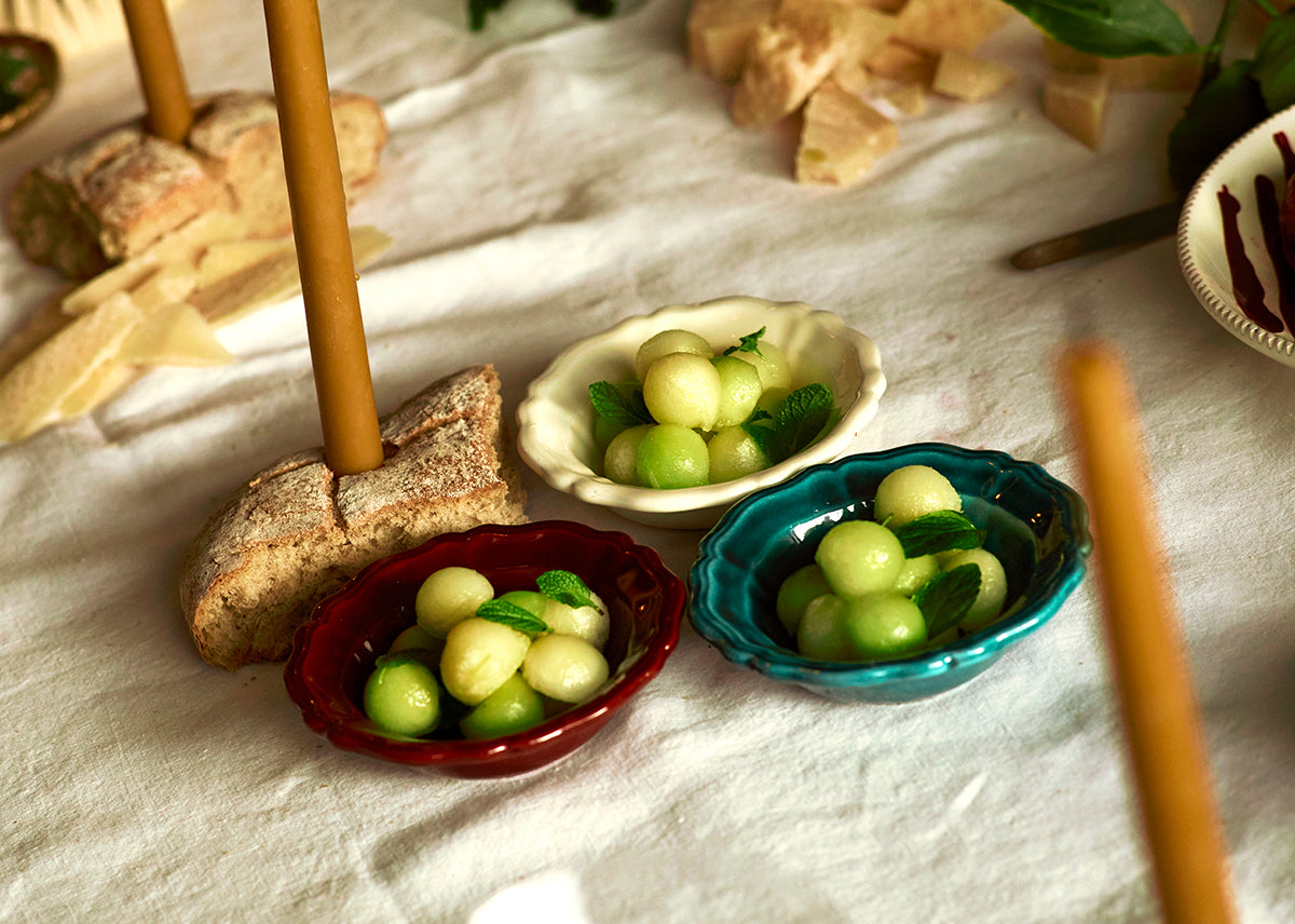 The small scalloped ceramic bowl is hand painted and made in Puglia, Italy. Each piece brings its own personality to the entertainers table with its rich Italian palette. This piece is designed to hold dips, olives and snacks for an afternoon aperitivo or long table occasion.