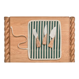 The set of cheese knives are beautifully packaged in an embroidered green and cream striped canvas knives wrap which is rolled and placed into a gift box, making the perfect gift or piece to bring out when entertaining with friends.